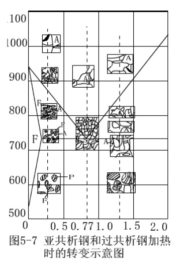 前面我們在分析Fe—Fe3C相圖時,知道亞過共析鋼與共析鋼組織的不同點在于,除了室溫組織中有P外,亞共析碳鋼還有先共析鐵素體,過共析鋼還有先共析二次滲碳體,因此,亞,過共析鋼的奧氏體化過程,除了有P轉(zhuǎn)化為A外,還有Fe,F(xiàn)e3C向A轉(zhuǎn)化與溶解的過程。