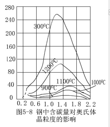 從圖中可以看出,在相同的溫度下,隨鋼中含碳量增大,A晶粒只寸也在增大,這是因為他們相互碰撞的機會增多,如快了晶粒的長大,但含碳量超過一定限度,A晶粒長大傾向反而減小,這是由于未溶的滲碳體質(zhì)點阻礙了晶粒長大,因此鋼中含碳量超過某個限度愈多,那么未溶滲碳體也越多,阻礙晶粒長大的作用也愈大,奧氏體晶粒長大傾向也就愈小,我們可以獲取較細小的奧氏體實際晶粒度。