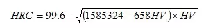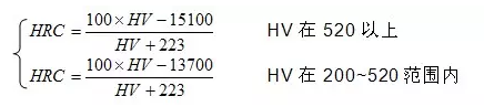此公式用我國公布的黑色金屬硬度標準數(shù)據(jù)進行換算,其HRC誤差基本上在±0.4HRC 范圍內(nèi),其最大誤差也僅士0.9HRC,計算的HV誤差最大為±15HV。