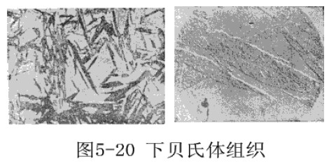 B下大約是在350℃至Ms點溫度范圍內形成,首先在A的貧碳區(qū)形成針狀鐵素體,然后想四周長大,由于轉變溫度更低,碳原子的擴散能力更弱,它只能在鐵素體內作短距離移動,因此在含碳過飽和的針形鐵素體內析出與長軸成55~60°的碳化物小片,這種組織稱下貝氏體,下貝氏體在光學顯微鏡下呈黑色針片狀形態(tài)。