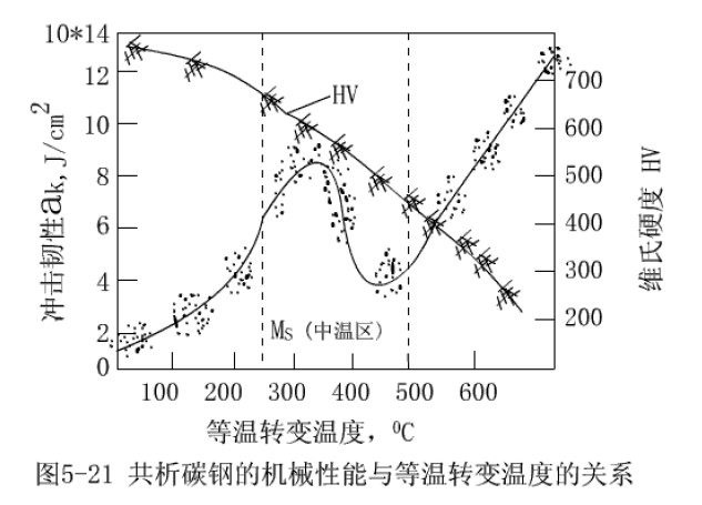 這個圖是共析碳鋼的機械性能與等溫轉變溫度的關系,從這個圖上可以看出,在350℃上貝氏體溫度轉變范圍內B上的強度,硬度越低,韌性也越低而BF相反(350℃至Ms)它的強度,硬度,塑性和韌性的綜合機械性能較高,因此生產中常采用等溫淬火獲取B下組織。