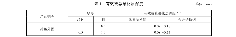 經(jīng)碳氮共滲熱處理的軸承零件的有效或總硬化層深度按表 1 的規(guī)定。