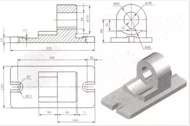 看標(biāo)題欄,了解零件名稱、材料和比例等內(nèi)容,從而大體了解零件的功用,從名稱判斷該零件屬于哪一類零件。從材料判斷該零件大致的加工方法。從比例判斷該零件的實際大小,從而對零件有初步的了解。